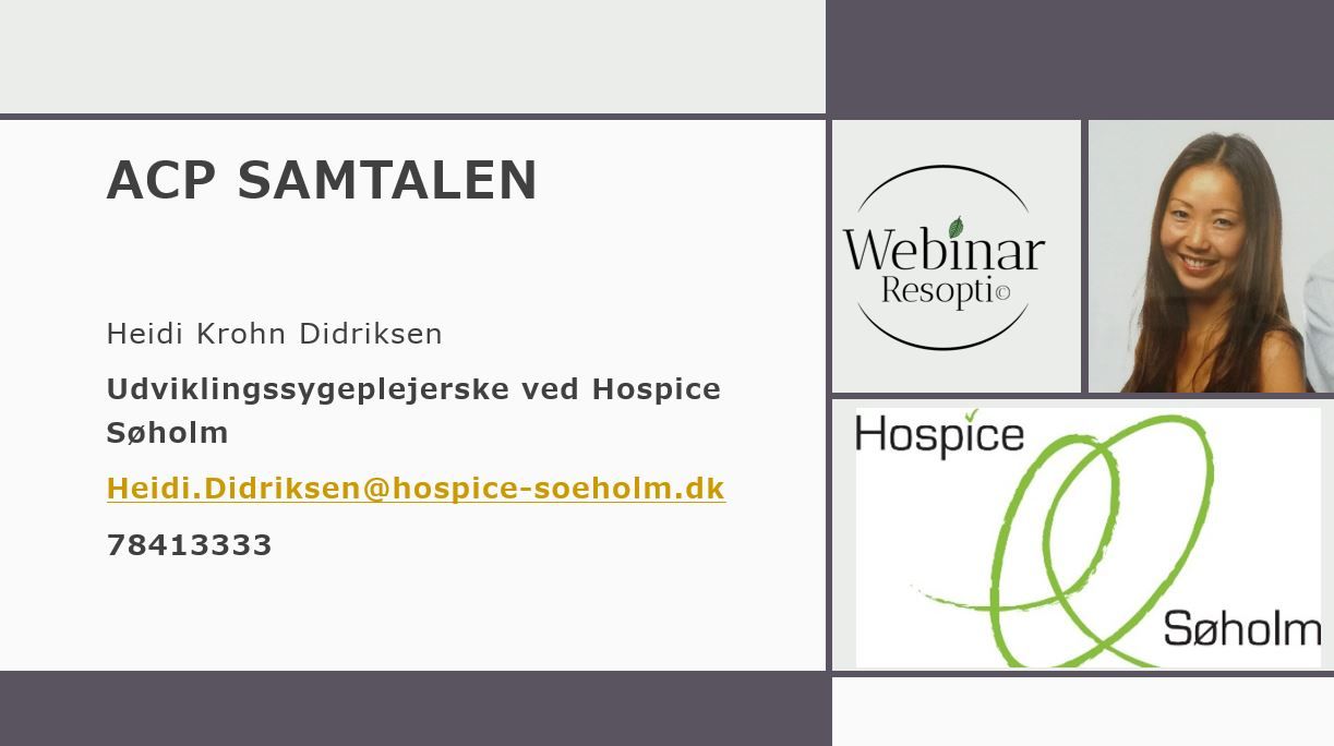 Udviklingssygeplejerske, Heidi Krohn Didriksen, underviser i Webinaret ACP-samtalen om, hvordan medarbejdere kan gennemføre ACP-samtalen i på plejecentre og i hjemmeplejeområder. Hun gennemgår ACP-samtalens formål og indhold og deler ud af sin erfaring med at facilitere ACP-samtalen. Heidi Krohn Didriksen giver også bud på, hvordan ACP-samtalen kan implementeres som en fast systematik i en organisation.