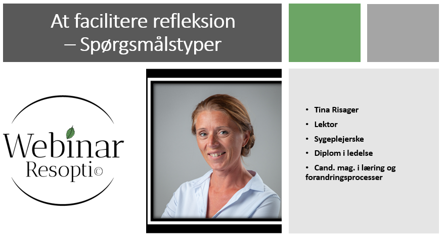 I webinaret At facilitere refleksion – spørgsmålstyper præsenteres professor i psykiatri Carl Tomms beskrivelse af de lineære, de cirkulære, de refleksive og de strategiske spørgsmålstyper. Webinaret inviterer til en refleksion over, hvordan facilitatoren didaktisk kan inddrage viden om spørgsmålstyper i planlægning og afvikling af faglig refleksion. Webinaret hører under kategorien Facilitering af refleksion og læring og kan med fordel ses i forlængelse af webinaret At facilitere refleksion – en vej til forbedrede handlinger.