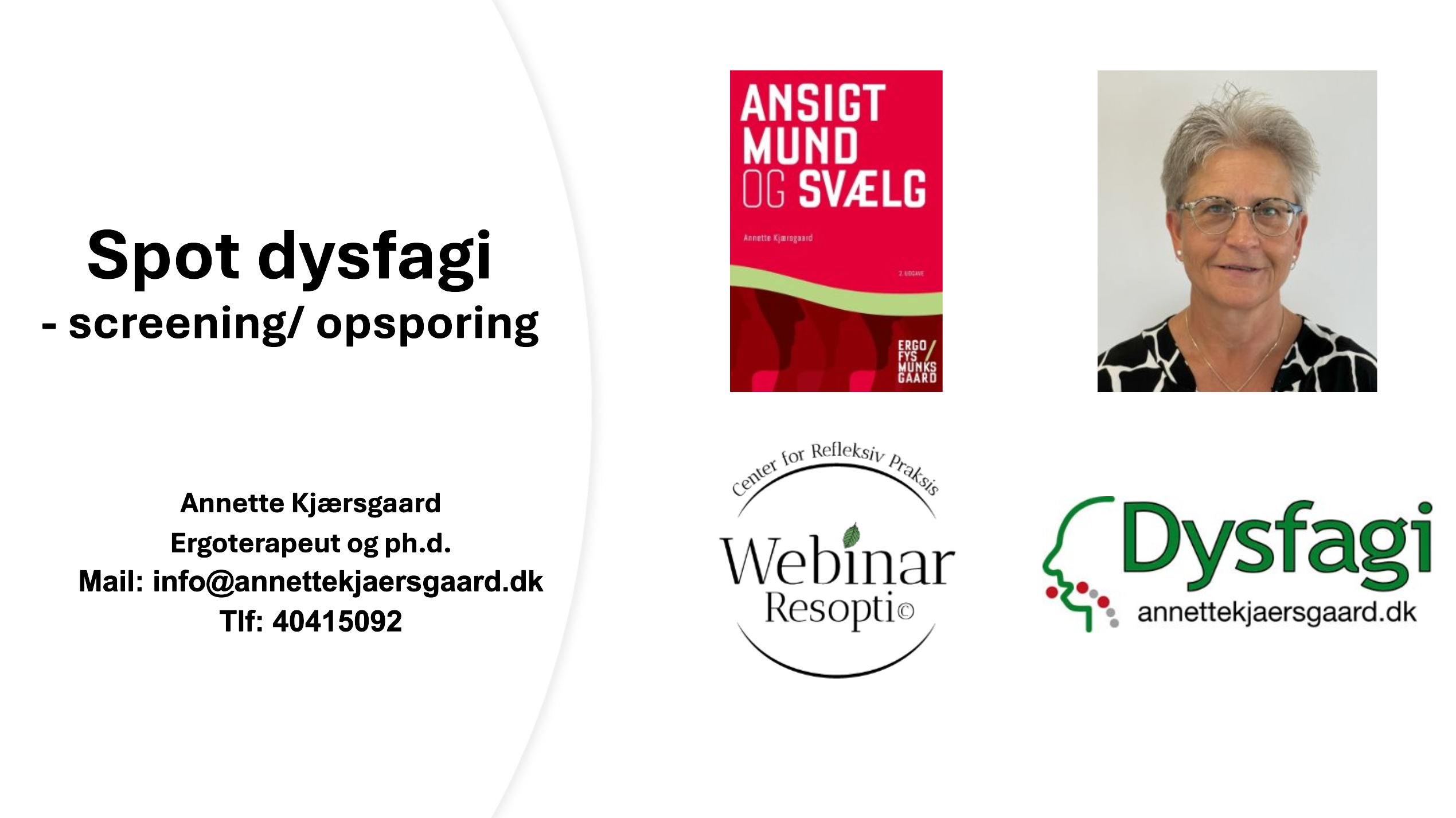 Når du har set webinaret Spot dysfagi har du hørt ergoterapeut og ph.d. Annette Kjærsgaard indlede med at give indblik i indirekte og direkte tegn på dysfagi. Du har fået en gennemgang af de punkter medarbejderne må være særligt opmærksomme på og du får indsigt i hvilken betydning tværfagligt samarbejde har i relation til at spotte dysfagi. Efter webinaret ved du, hvornår det er relevant at henvise til en ergoterapeut. Slutteligt er du præsenteret for Spørgsmål til refleksion, og du kan bruge litteraturlisten som inspiration til at søge yderligere viden.