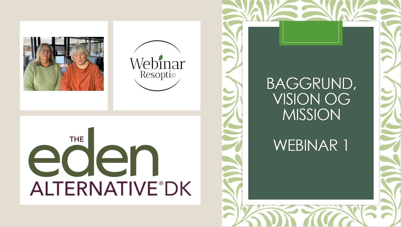 Landskoordinatorerne Aase Porsmose og Karin Dahl fra The Eden Alternative®DK præsenterer i det første ud af tre webinarer Eden Alternatives baggrund, mission og vision. I det efterfølgende webinarer 2 introduceres Eden Alternatives metode og ti principper. Det tredje webinar giver et indblik i den praktiske anvendelse af Eden Alternatives metode, principper og Eden-hjælpere i hverdagen fra et leder- og medarbejderperspektiv.