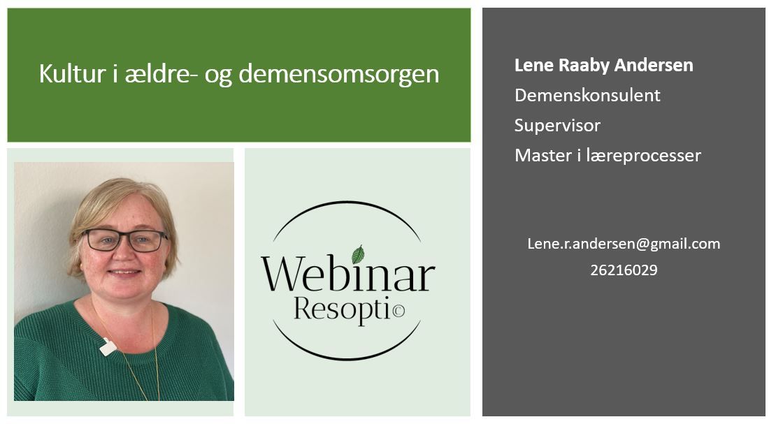 I webinaret Kultur i ældre- og demensomsorgen, introducerer Lene Raaby Andersen til betydningen af kultur som en støvbold. Hun beskriver vigtigheden af at skabe en fælles kultur med et fælles formål og hvordan både ting, handlinger og ord kan tilskrives fælles betydning gennem refleksion og dialog. I webinaret relateres de teoretiske begreber hele tiden til den daglige praksis i ældreplejen