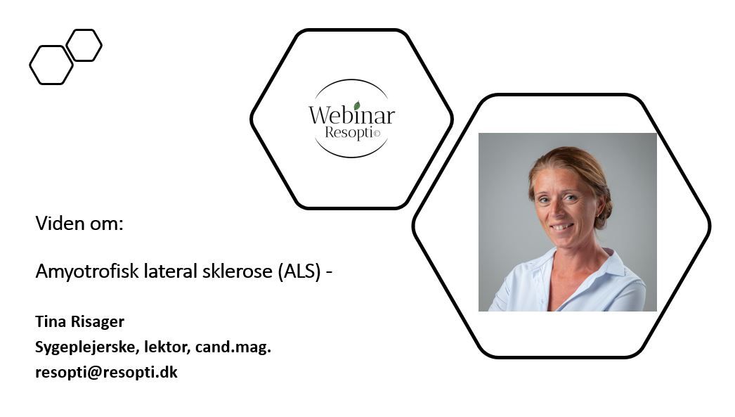I webinaret Viden om Amyotrofisk Lateral Sclerose (ALS) underviser sygeplejerske og lektor Tina Risager i grundlæggende viden om hyppighed og symptomer ved ALS og sammenholder dette med et borgerperspektiv fra Henrik Nonbo og den erfarne SOSU-assistent Bettina Gregersen fra respirationsteams. Der ligger nu tre webinarer på Webinar Resopti© om ALS. I webinaret gennemgås sygdomsforløbets seks faser og der henvises til anbefalinger for den palliative pleje. Se webinaret HER